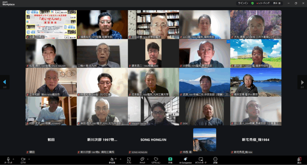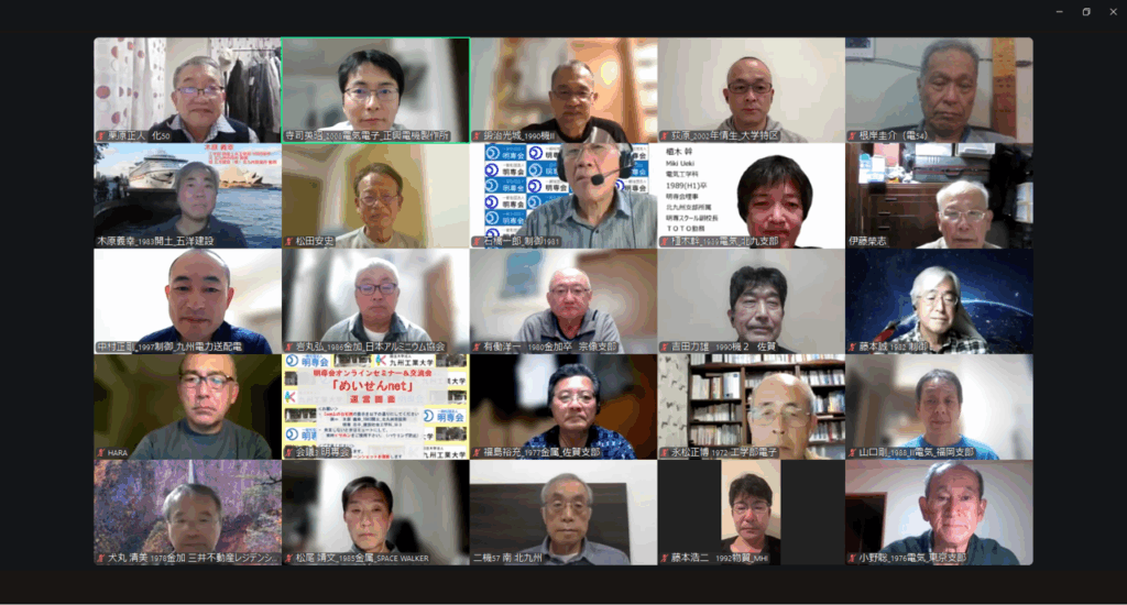 「めいせんnet」は、会員相互の交流機会をさらに増やし、明専会の絆を強化・拡大し、会員の「人間力」の向上、明専会の活性化と永続性を目指すとともに、九工大の支援強化を図ることを目的に、明専会の「110周年記念事業」の正規事業「同窓の絆拡大推進」として、全国の7支部(東京、中京、大阪・神戸・京滋、広島、北九州、福岡、大学)が主体となって実施するオンラインセミナー&交流会です。