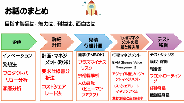 持田先生のおはなしは、プロジェクトを進めるに当たって、目指す製品は、「魅力は、利益は、面白さは」という観点から、プロジェクトを企画、詳細計画、見積・行動計画、工程マネジメントの課題と解決策、テスト・稼働の5つのフェーズに分けて、それぞれのフェーズでのポイントと考え方、具体的な手法などを交えて、プロジェクトを推進する進め方について教えて頂きました。日本式・欧米式の考え方・進め方を明示しながら日本におけるプロジェクトの特性についても判りやすく説明頂きました。
