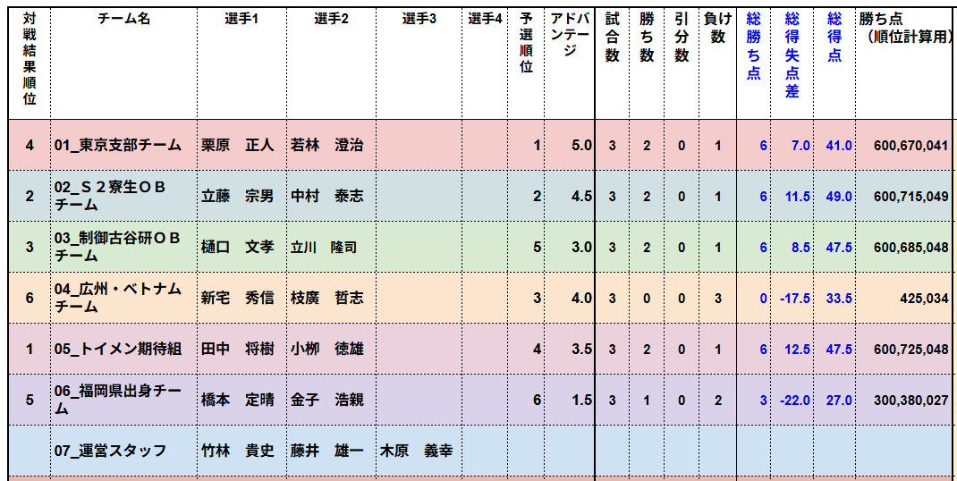 1位~3位はいずれも2勝1敗で、特に優勝と準優勝は総得失点差の差が1.0点と
