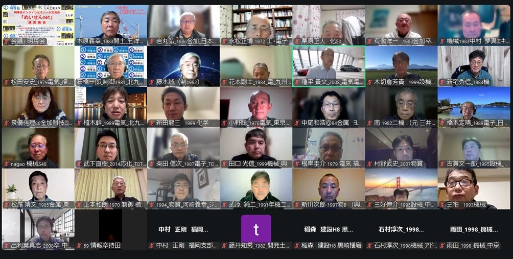 「めいせんnet」は、会員相互の交流機会をさらに増やし、明専会の絆を強化・拡大し、会員の「人間力」の向上、明専会の活性化と永続性を目指すとともに、九工大の支援強化を図ることを目的に、明専会の「110周年記念事業」の正規事業「同窓の絆拡大推進」として、全国の7支部(東京、中京、大阪・神戸・京滋、広島、北九州、福岡、大学)が主体となって実施するオンラインセミナー&交流会です。