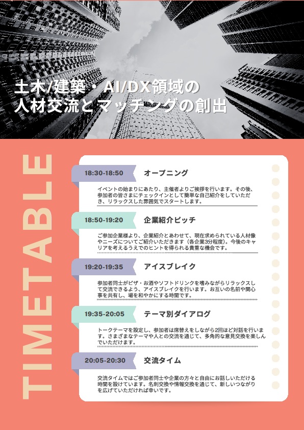 対 象:アソシエ(九州工業大学卒業生、リスキリング講座受講者など)、土木/建築分野, AI/DX分野 に興味のある方!、中途採用募集枠をお探しの方、建築業界に興味のある学生
