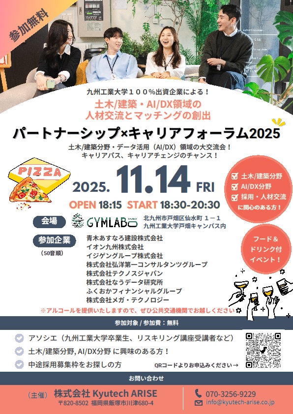 下記のとおり、株式会社Kyutech ARISE 主催 パートナーシップ×キャリアフォーラム2025を開催いたします。